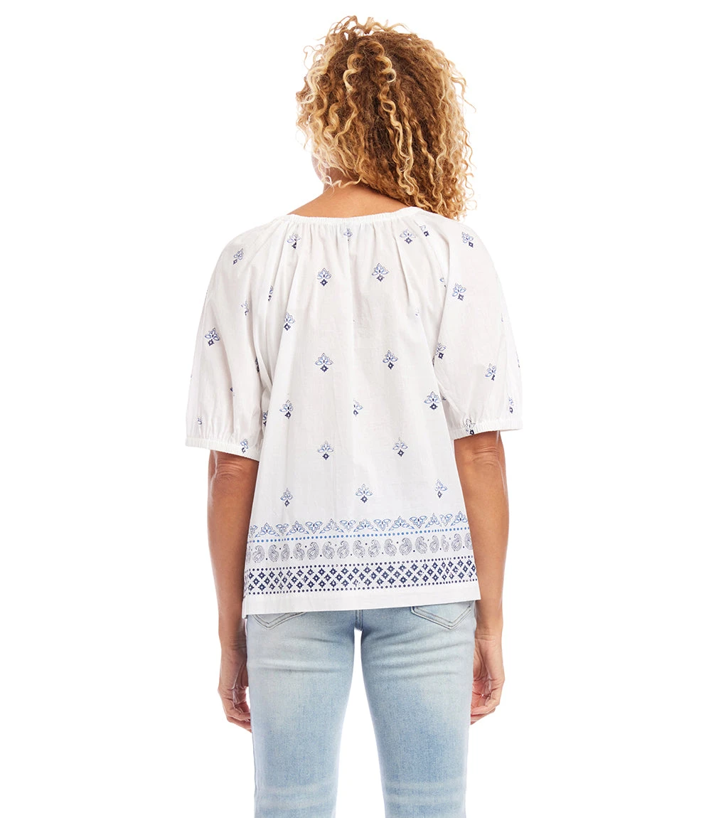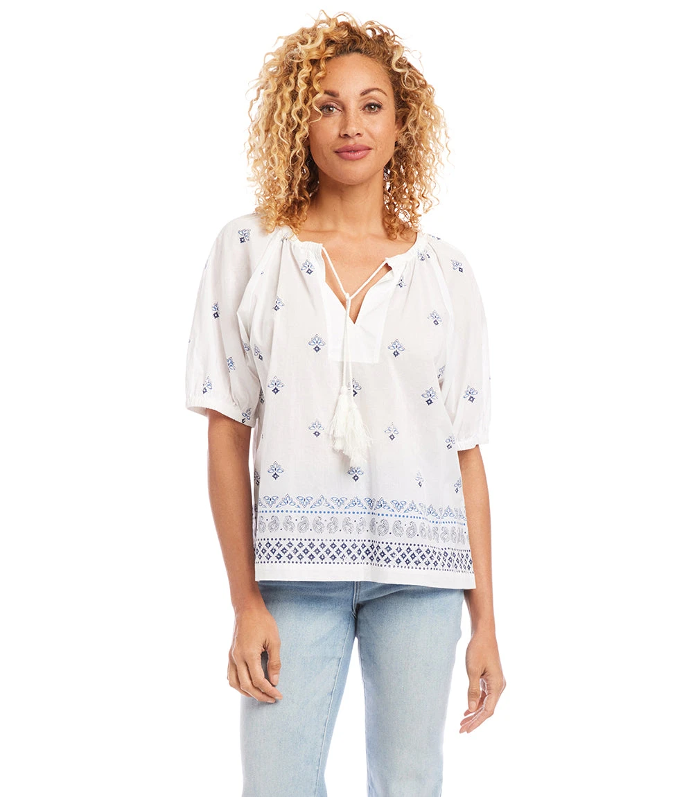 Lightweight cotton gives a breezy quality to this peasant top detailed with charming paisley print. Pair this top with high-waist jeans for a polished look.