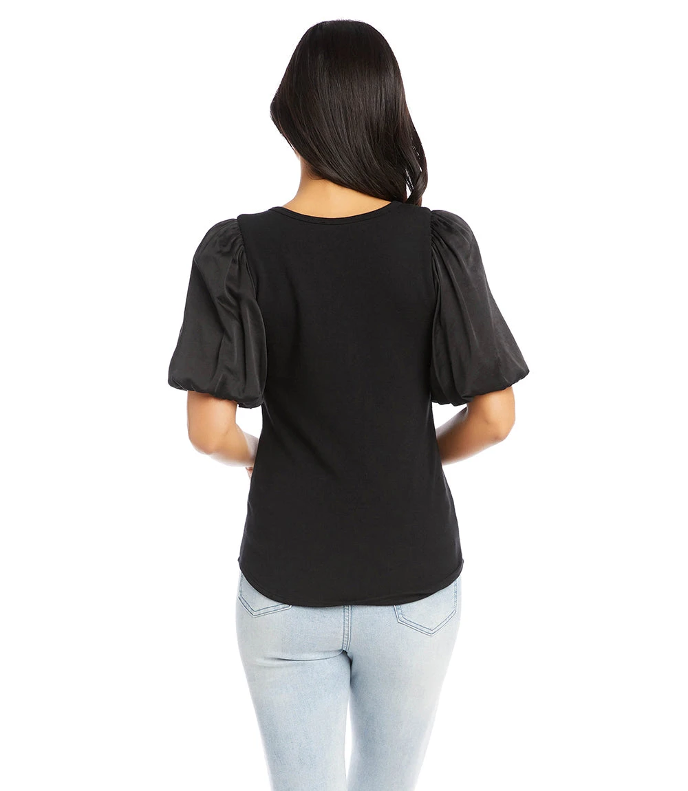 Buttery, soft french terry shapes this top detailed with statement-making puff sleeves cut from rich silky satin. This top can easily elevate your everyday look.