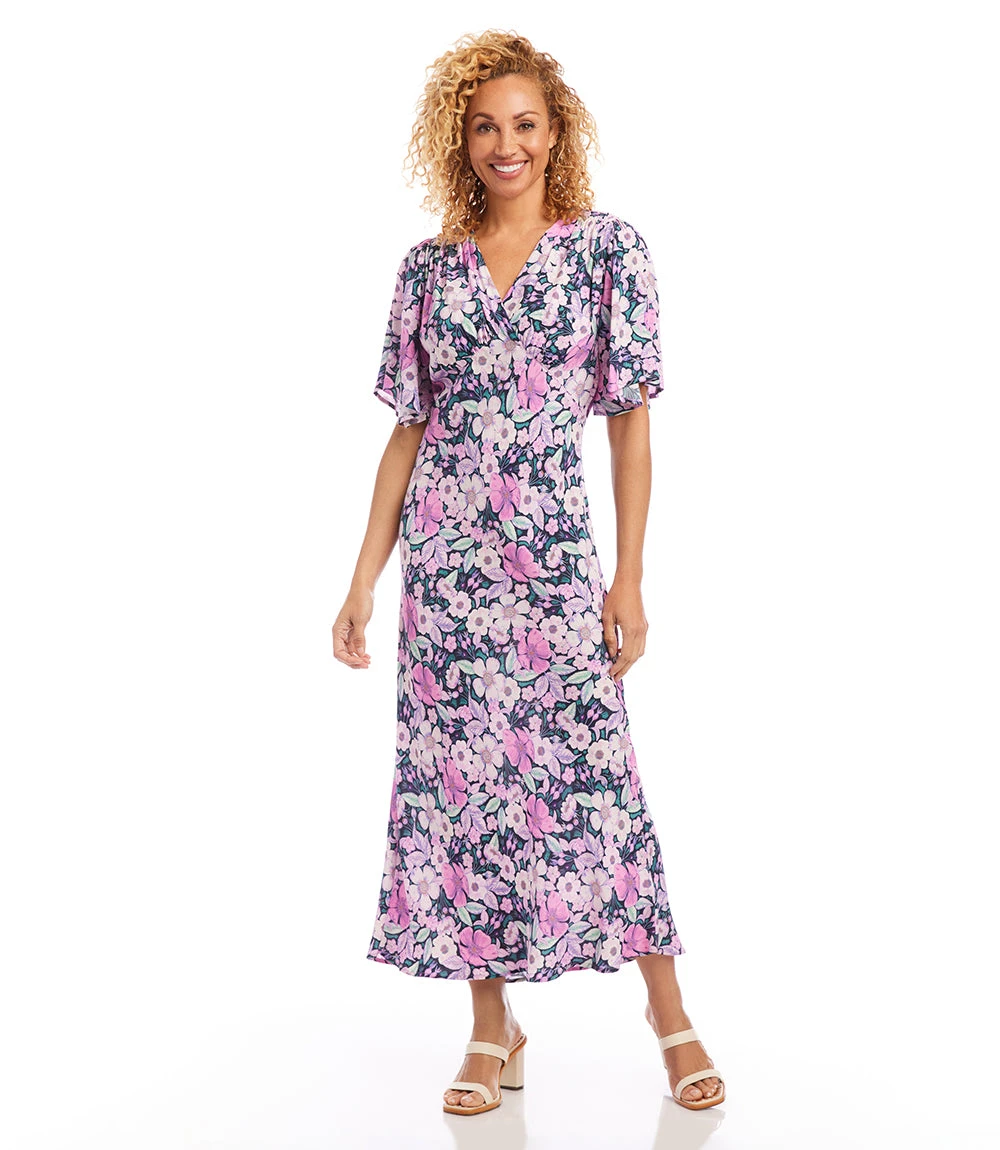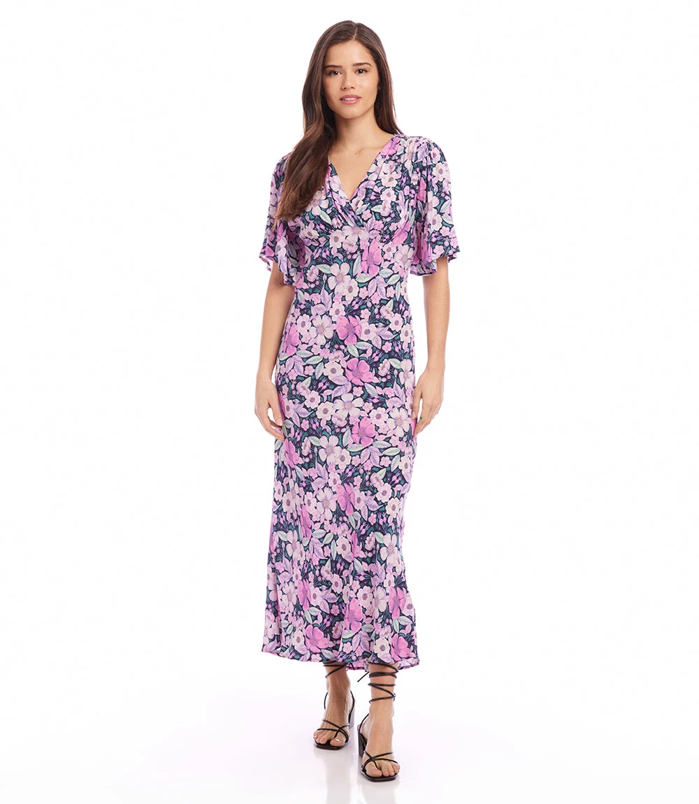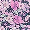 A chic new dress styled in a colorful bouquet of pink petals and contrasting shades of navy and off white.