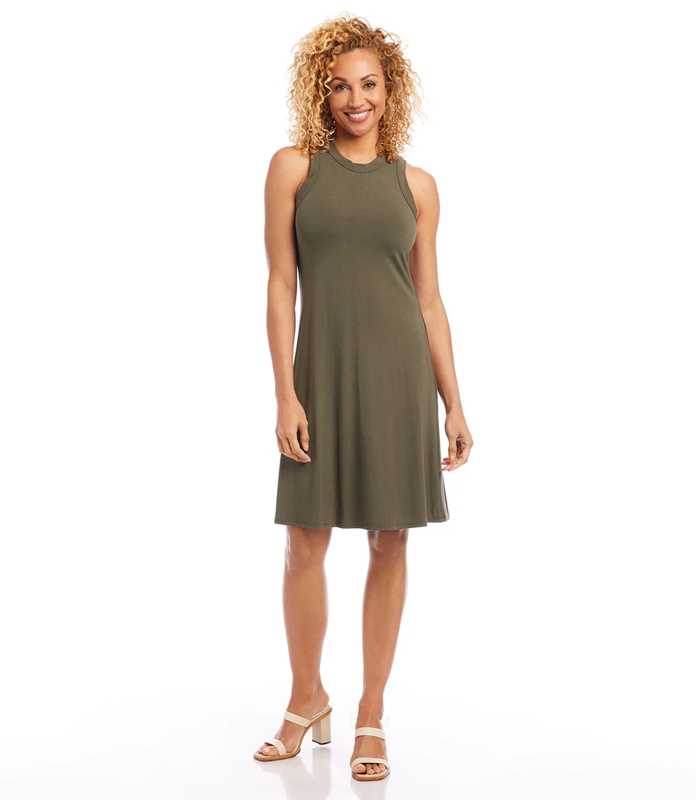 A simple yet stylish closet essential, this Karen Kane dress starts with a high neckline then falls to a flattering a-line silhouette.
