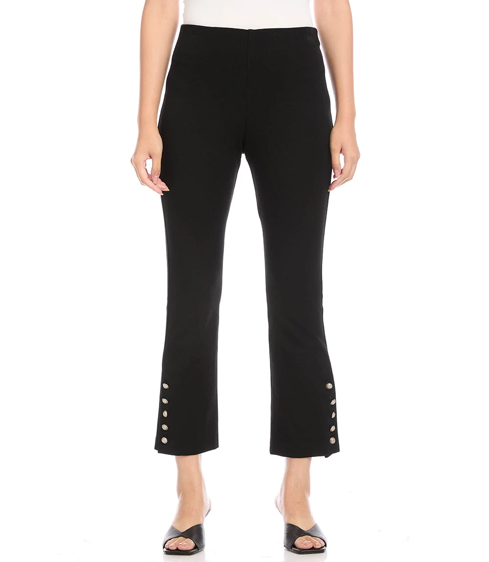 Embossed silver buttons decorate these cleanly styled pants in a modern flare-leg. These pants offer a smooth fit with double stretch for exceptional comfort and shape-retention.