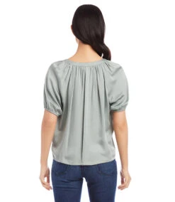 Standout in this knit top that sparkles with shimmering metallic threads. Its puff sleeves and stylish front twist complete the look.