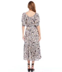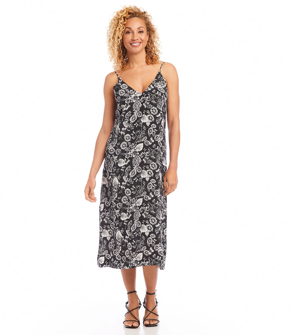 A monotone floral bouquet makes a statement on this stunning dress with adjustable straps and a side slit for easy movement.