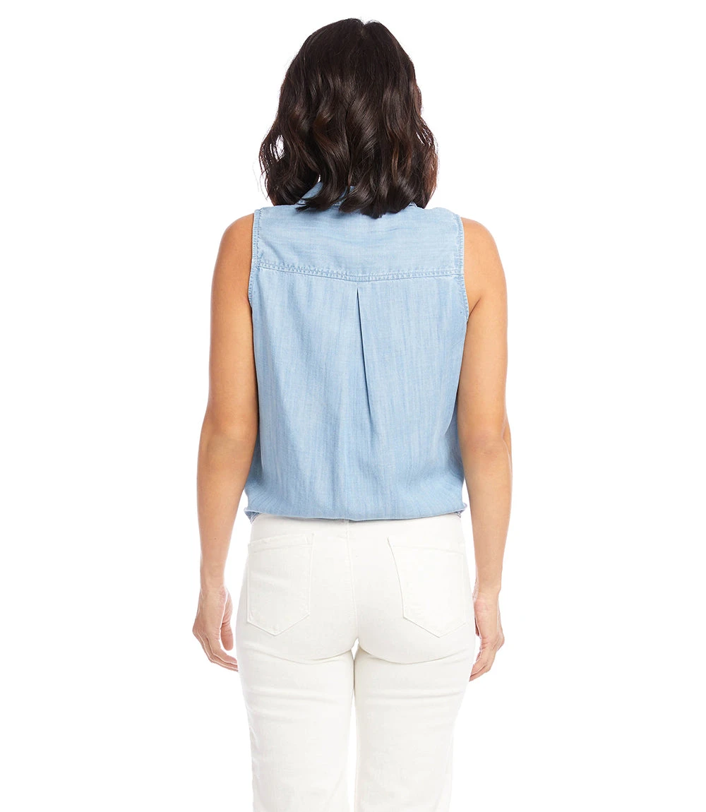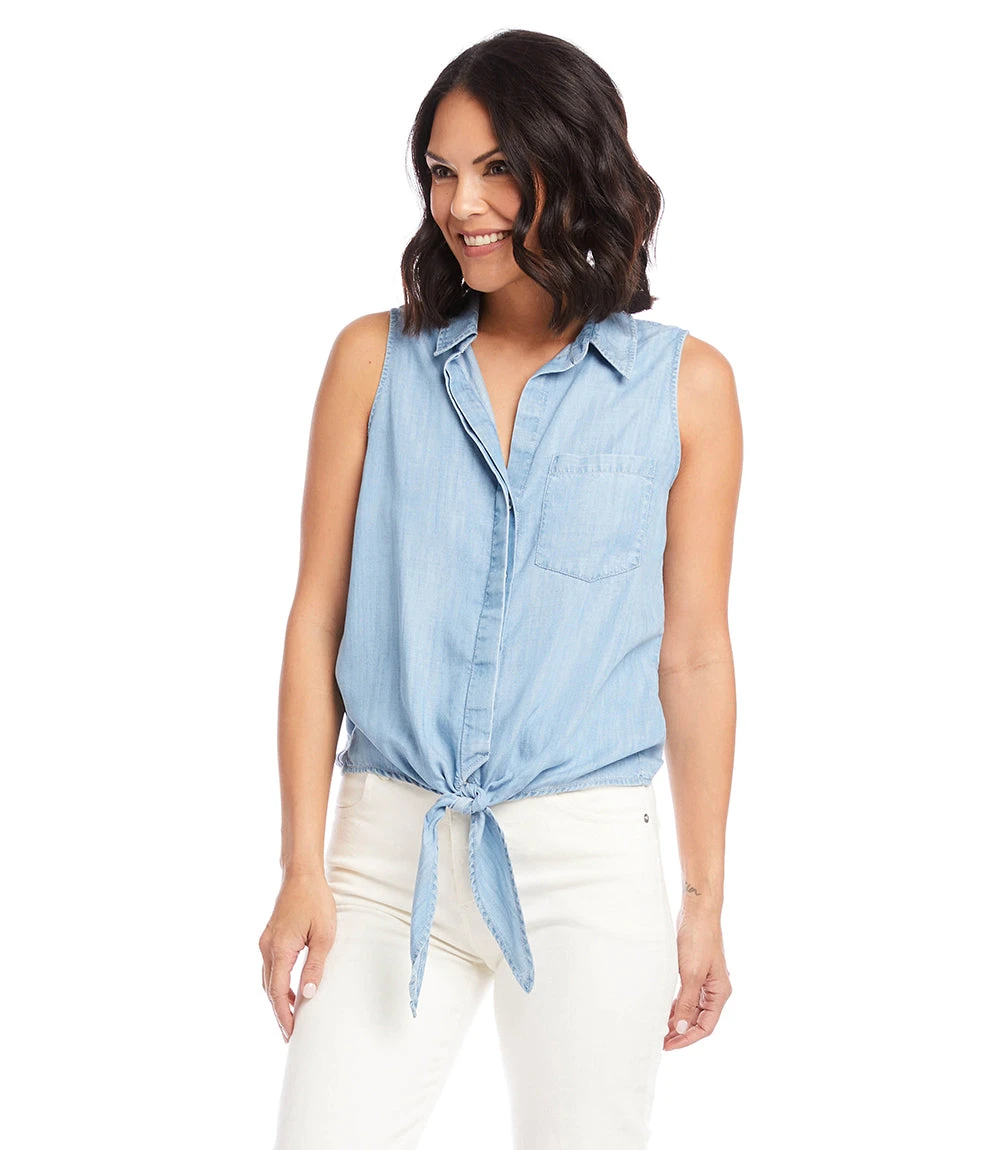 Effortless style and comfort meet in this relaxed chambray top that’s finished with a tie for added shape. Wear it with your favorite pair of white denim for an easy look.