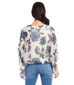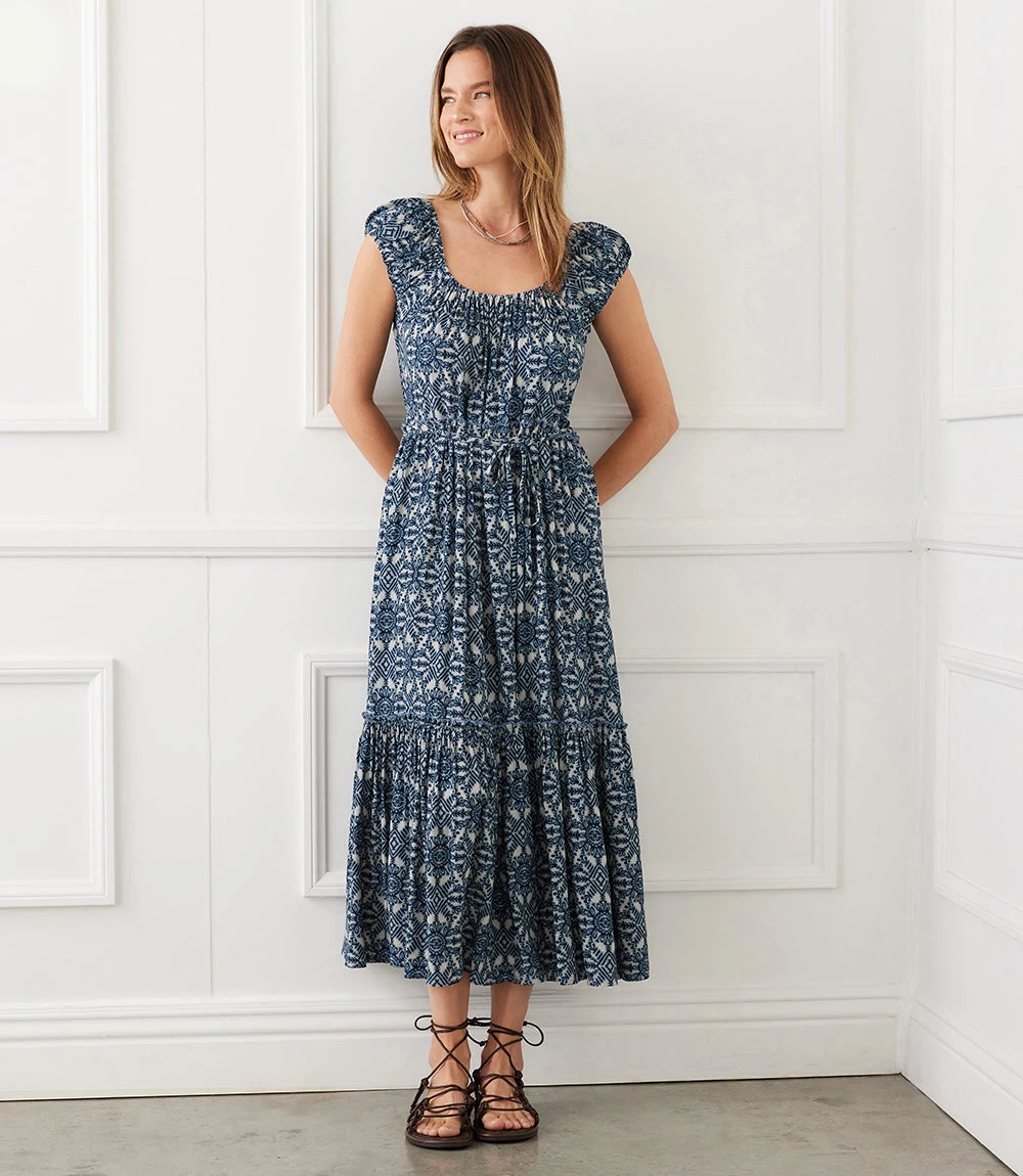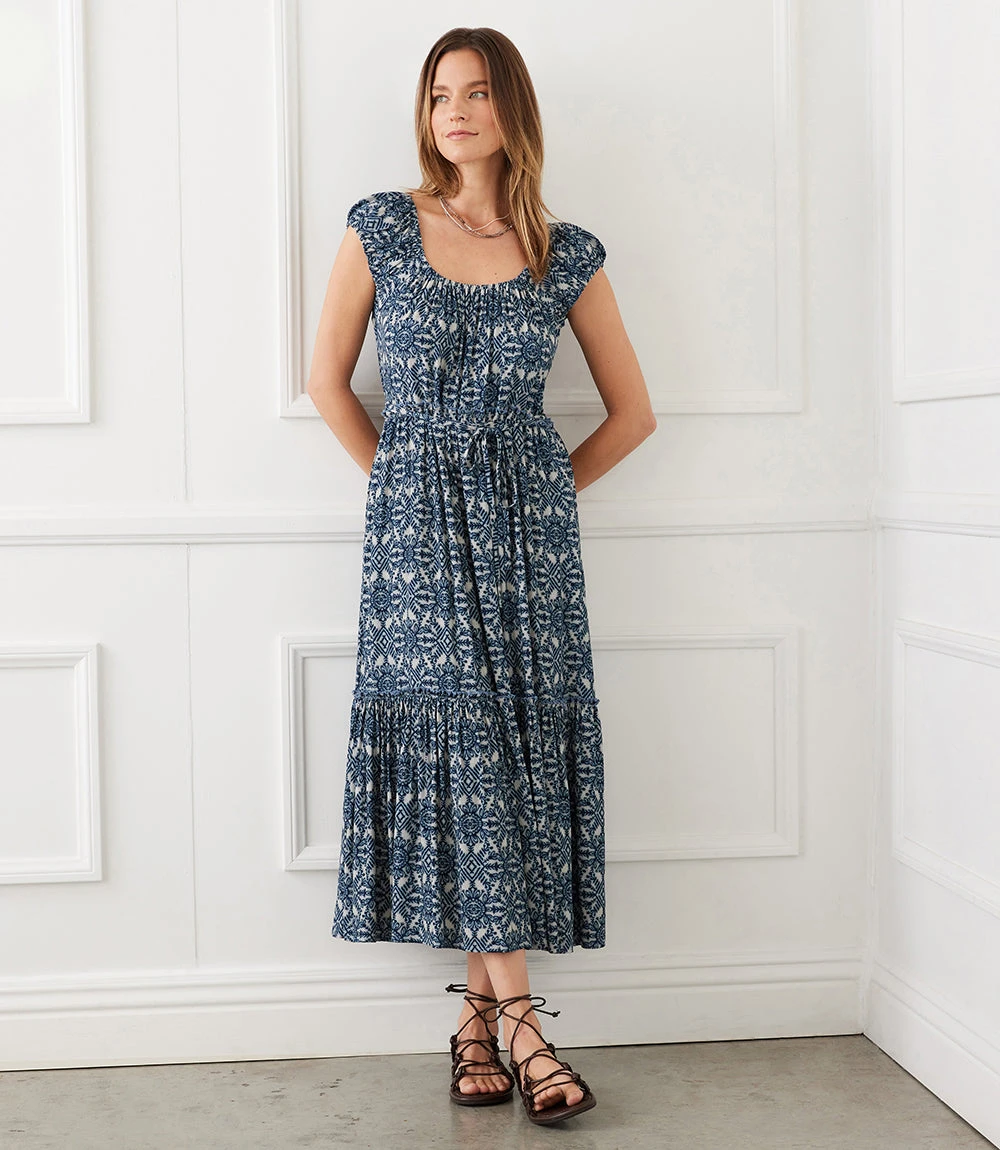 This sleek dress features shirred cap sleeves and a batik-inspired indigo print. A cinched tie at the waist and cascading tiers create a figure-flattering silhouette.