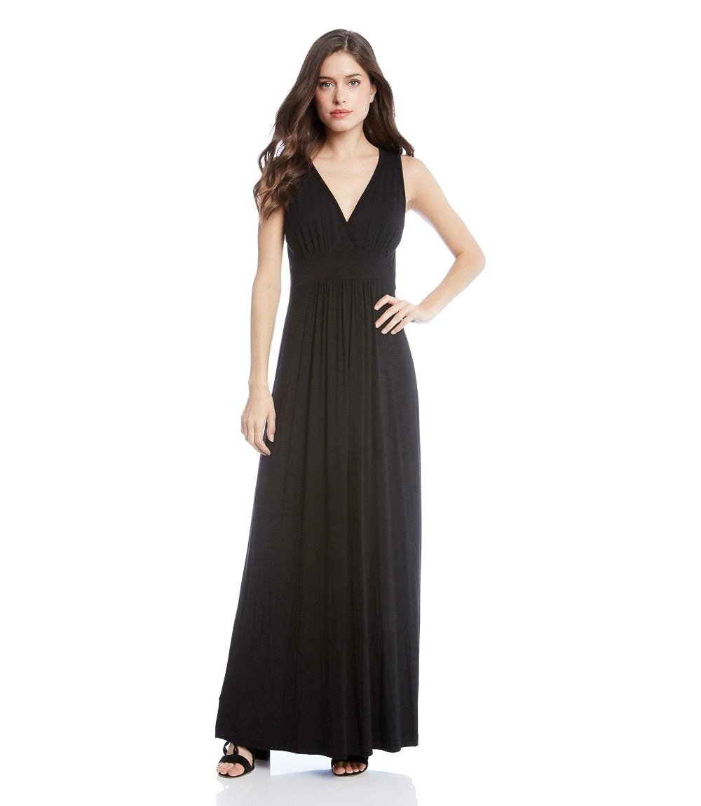 Elegantly draped pleats at the surplice bodice and skirt add sophistication to this floor length dress cut from soft jersey-knit fabric. The maxi silhouette is both figure-flattering and comfortable.